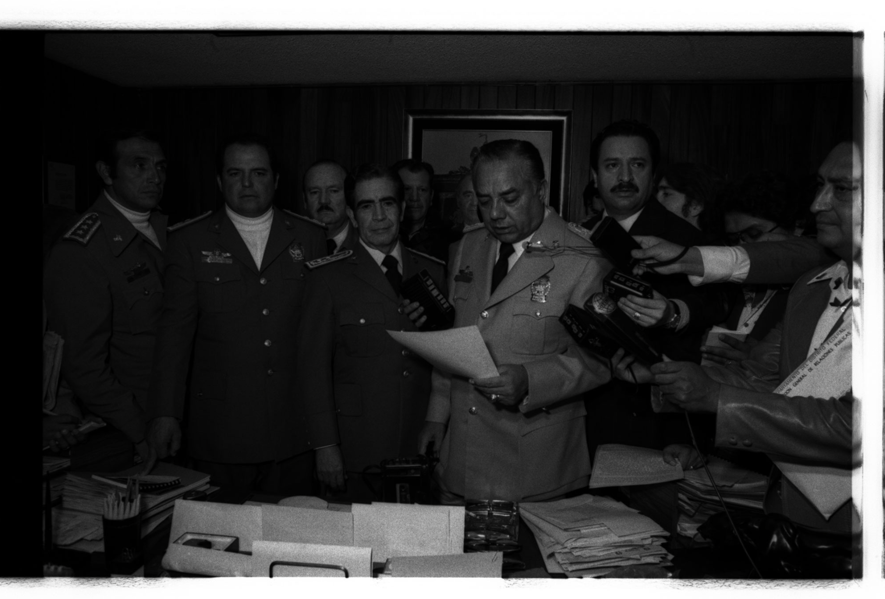 Documentos CDMX-SC-DGGICI-CRC-SMT-GRA-00027 Descargar MetadatosNúmero de clasificaciónCDMX-SC-DGGICI-CRC-SMT-GRA-00027Título de la obraEntrevista de prensa del general, Arturo Durazo, director de Policía y TránsitoTítuloEntrevista de prensa del general, Arturo Durazo, director de Policía y TránsitoTipo de objetoFotografíaAutor(es)/Caricaturista/DibujanteNo identificadoFecha de elaboración7 julio, 1977TemasPolicía, Tlaxcoaque, Director, Arturo DurazoDescripciónImágenes de Arturo Durazo y miembros de su equipo de trabajo en una conferencia de prensaLugar del acontencimientoDistrito Federal > CuauhtémocNota del lugar del acontecimientoInterior del edificio de TlaxcoaqueIntitución de procedenciaMuseo Archivo de las FotografíaSecciónDirección General de Comunicación Social del Departamento del Distrito FederalCaja/ Volumen18266Expediente"MX-MAF-DGCSGDF-018266-004-33 MX-MAF-DGCSGDF-018266-008-37 MX-MAF-DGCSGDF-018266-019-04 "Colección en el Sitio de MemoriaGráfica Previous itemComputadora de la Dirección de Ingeniería de Tránsito y Transporte Next itemDirección General de Ingeniería de Tránsito y Transporte. Visita de salvadoreños