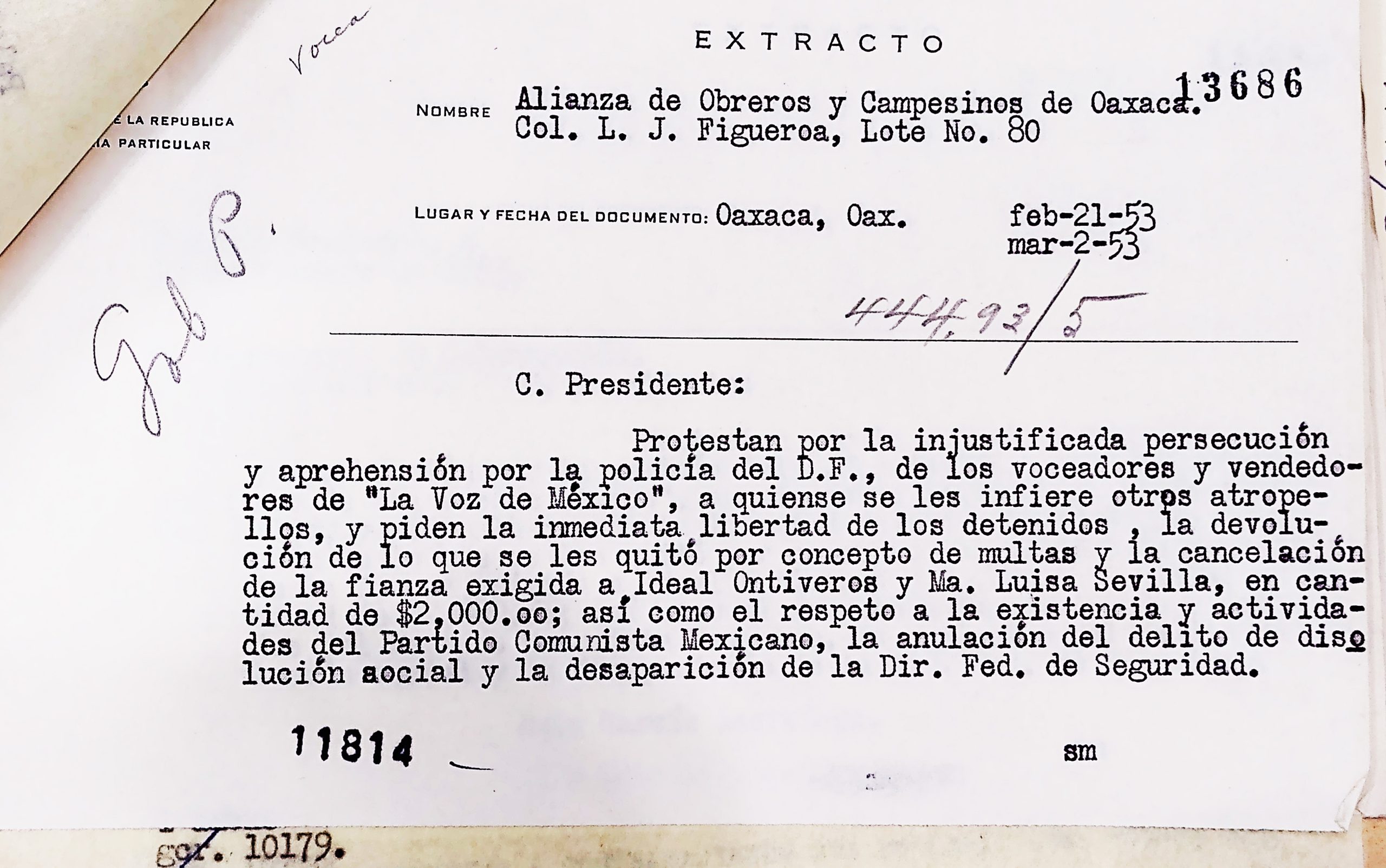 Telegramas donde se pide a las autoridades la liberación de voceadores y vendedores, detenidos por la venta del periódico "La Voz de México", órgano central del Partido Comunista. Prominentes figuras como Diego Rivera, David Alfaro Siqueiros y Gabriel Figueroa exigen que pare la persecución contra los voceadores y vendedores de dicho periódico por parte de la policía del Distrito Federal