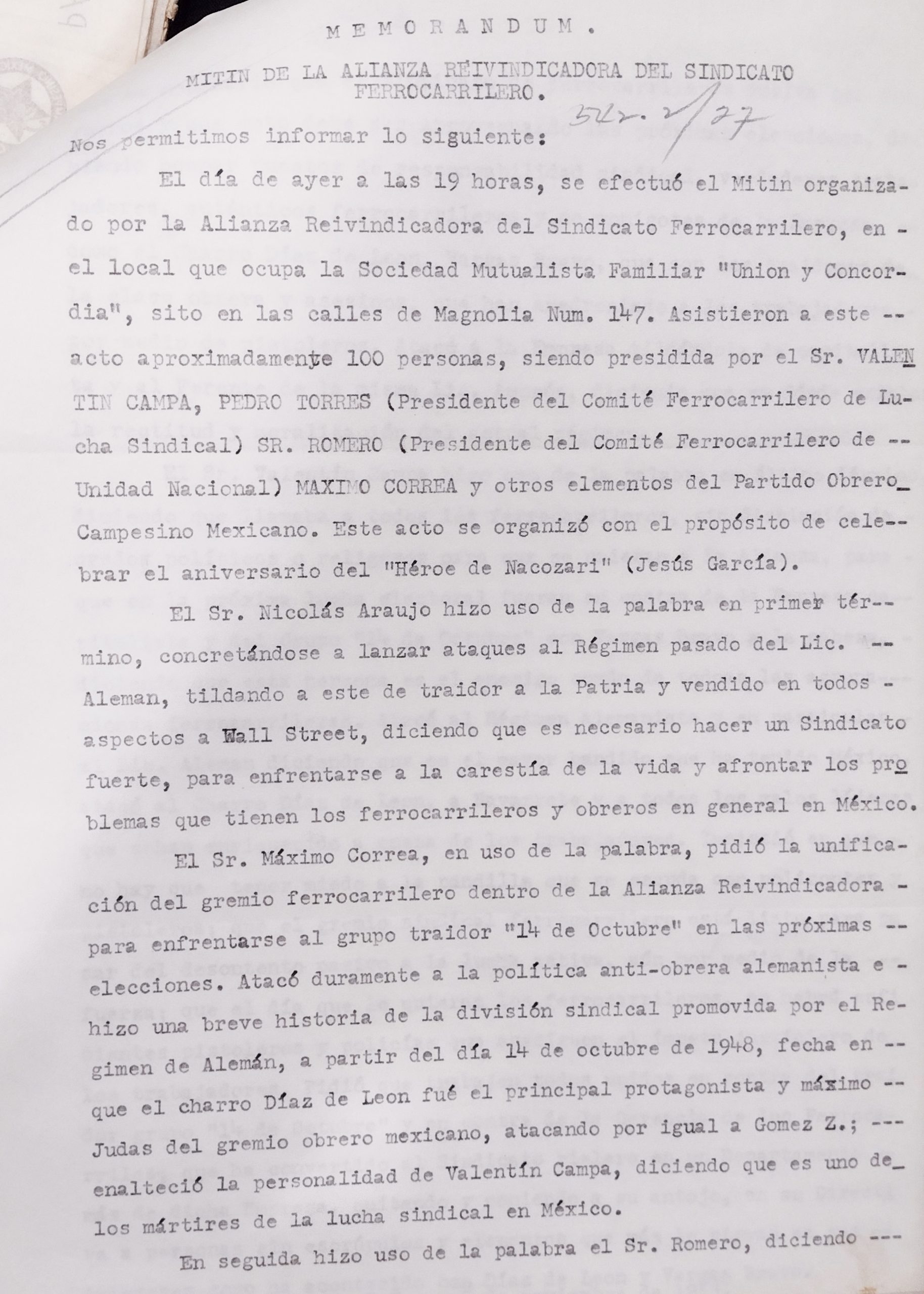 Informe sobre las actividades de la Alianza Reivindicadora del Sindicato Ferrocarrilero. Contiene un seguimiento a Valentín Campa, el cual se presento en dicho mitín. Telegramas referentes a la liberación de Valentín Campa y su esposa, los cuales fueron arrestados